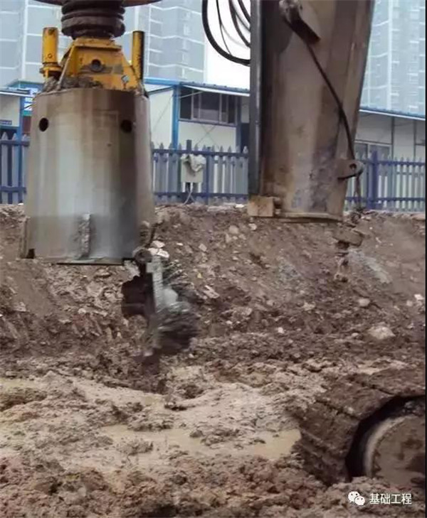 旋挖鉆機成孔首先是通過底部帶有活門的桶式鉆頭回轉(zhuǎn)破碎巖土,并直接將其裝入鉆斗內(nèi),然后再由鉆機提升裝置和伸縮鉆桿將鉆斗提出孔外卸土,這樣循環(huán)往復,不斷地取土卸土,直至鉆至設計深度。對粘結(jié)性好的巖土層,可采用干式或清水鉆進工藝,無需泥漿護壁。而對于松散易坍塌地層,或有地下水分布,孔壁不穩(wěn)定,必須采用靜態(tài)泥漿護壁鉆進工藝,向孔內(nèi)投入護壁泥漿或穩(wěn)定液進行護壁。